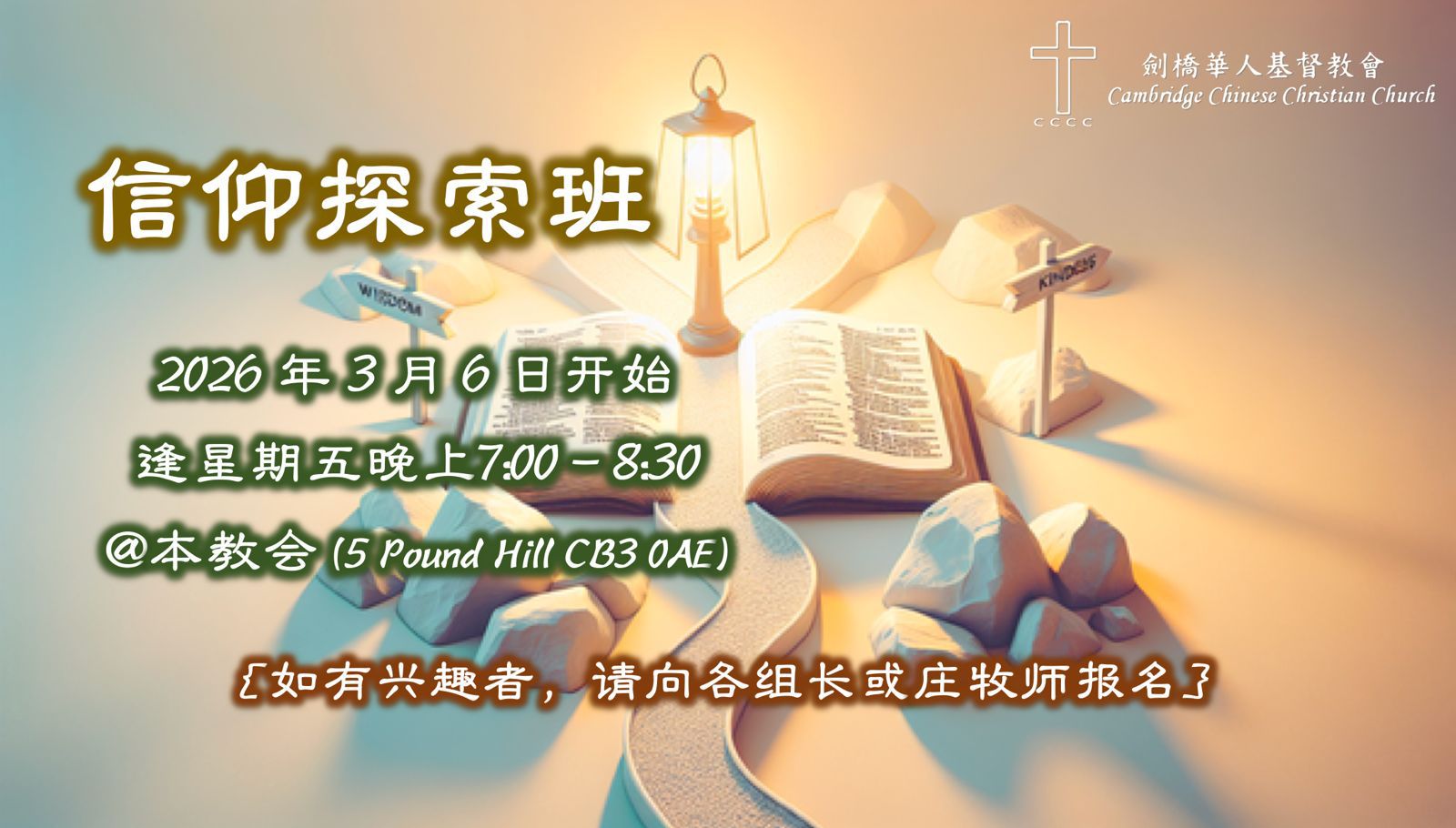 無論你將要來到劍橋,或是已經居住在劍橋,你若對基督教信仰或我們的教會想更深入瞭解,我們都歡迎您隨時與我們聯繫。